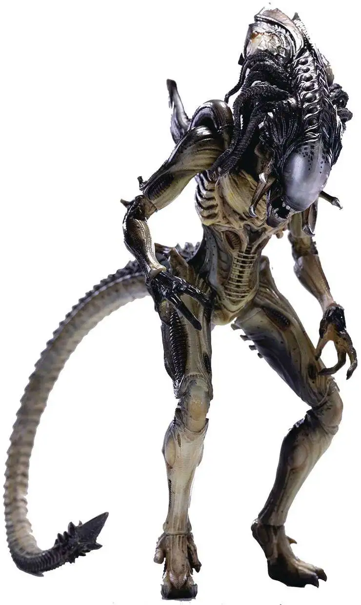 From Hiya Toys. A PREVIEWS Exclusive! From the film Aliens vs. Predator: Requiem a Chestburster erupts from Scar’s chest; it is a Predalien, a mix of Yautja and Xenomorph! This powerful creature possesses mandibles, dreadlocks, a yellowish hide, with a large multi-spiked blade for a tail. The dome covering the Predalien’s head has been faithfully recreated in 1/18 scale along with it’s tail, which is thicker and longer than a drone. This 5.7″ figure features incredible articulation and comes packaged in a window box. Don’t miss out on adding the Predalien to your collection!
