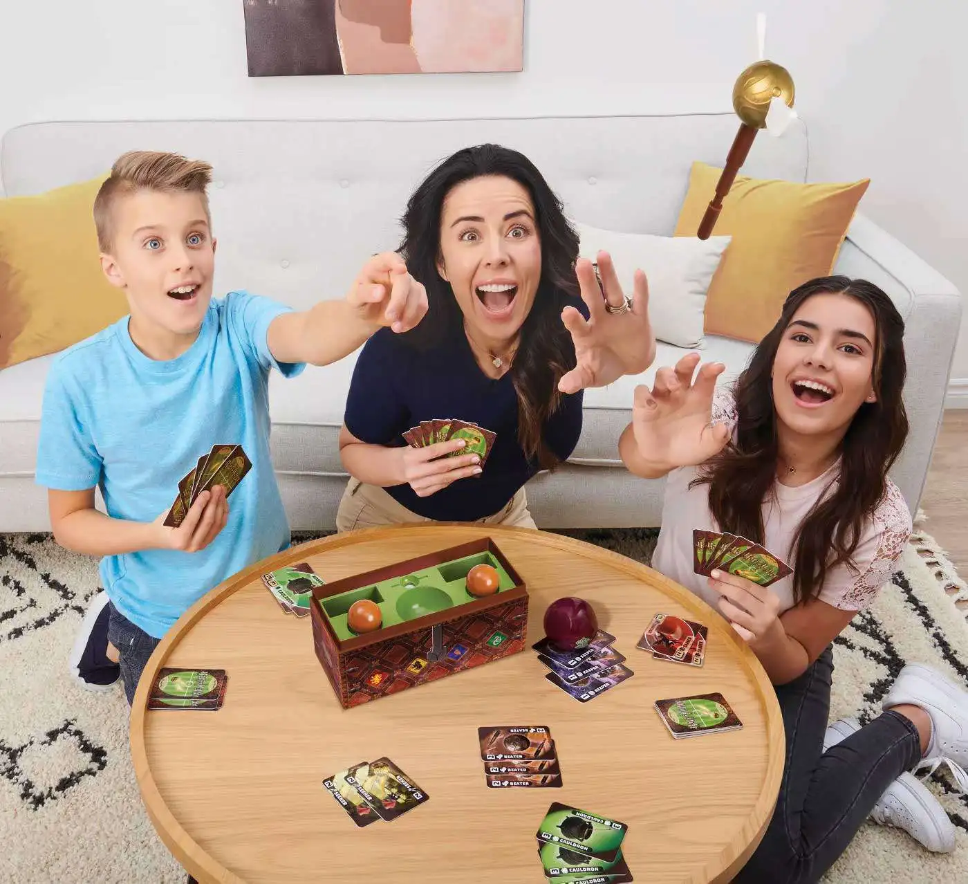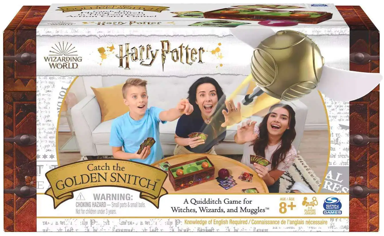 Bring all the speed and excitement of a real Quidditch match to your home with Catch the Golden Snitch, a Quidditch game for witches, wizards, and muggles. Everyone plays at the same time as cards are quickly passed from player to player, each trying to build sets and earn points. In the center of the action lies an open Quidditch Chest, with a Quaffle, two Bludgers, and the all-important Golden Snitch. When you lay down certain cards, these magical items come out to play! A pair of Chaser cards lets you steal another players set, but if youve earned the Quaffle, youre safe. Play a pair of Bludger cards, grab a Bludger, and throw it at a player of your choice — if they swat the Bludger in air and it hits another player, that player must discard the cards in their hand. The action moves faster than a Nimbus 2000 as cards change hands, sets hit the table, and Bludgers hit their mark. When the Golden Snitch launches from the chest and into the air, grab it its worth extra points! The game ends when the Golden Snitch is in hand; the player with the most points wins. For fast-paced action and excitement, play Catch the Golden Snitch with your wizarding family and friends. For ages 8+, 3 to 4 players.