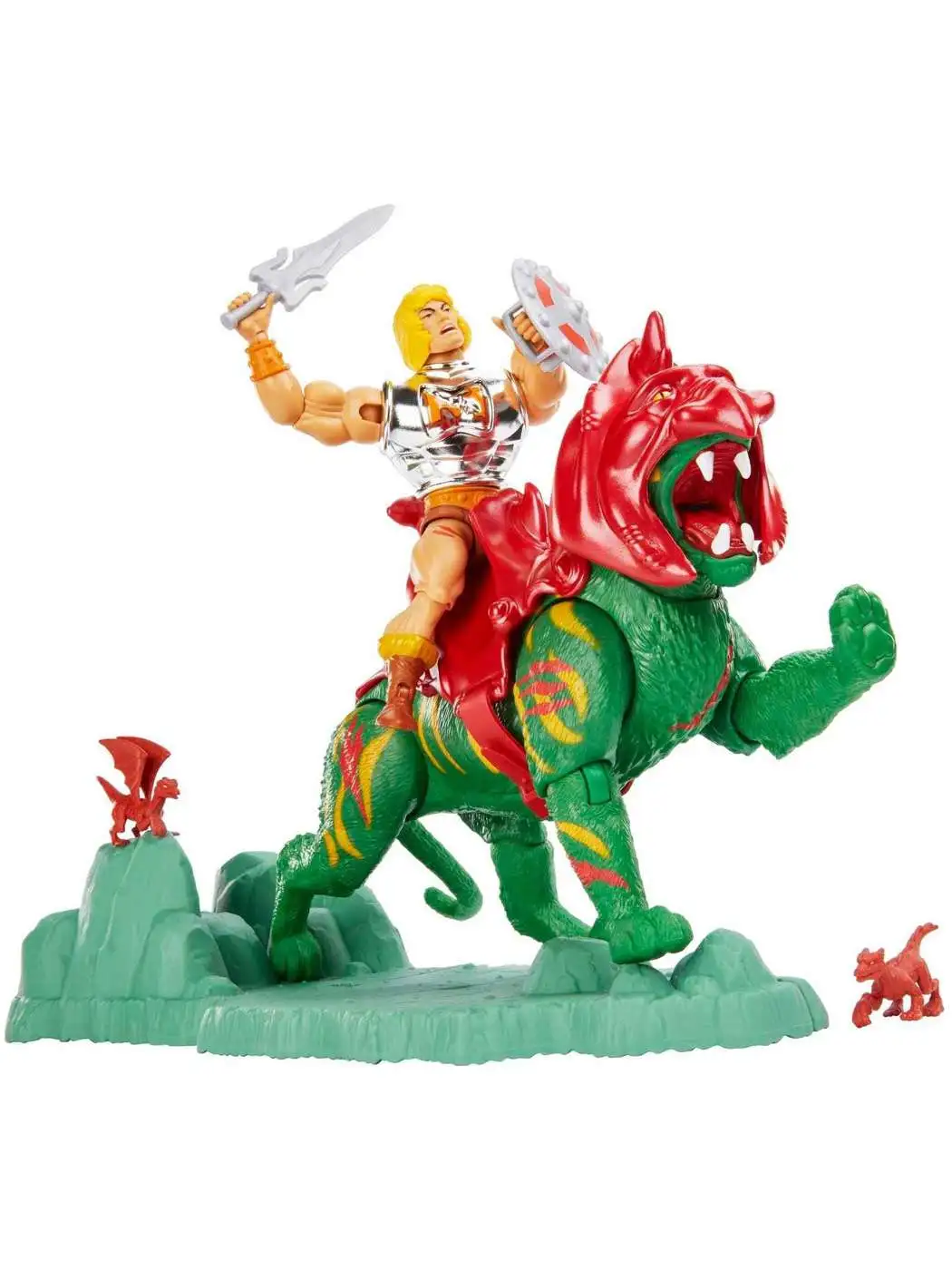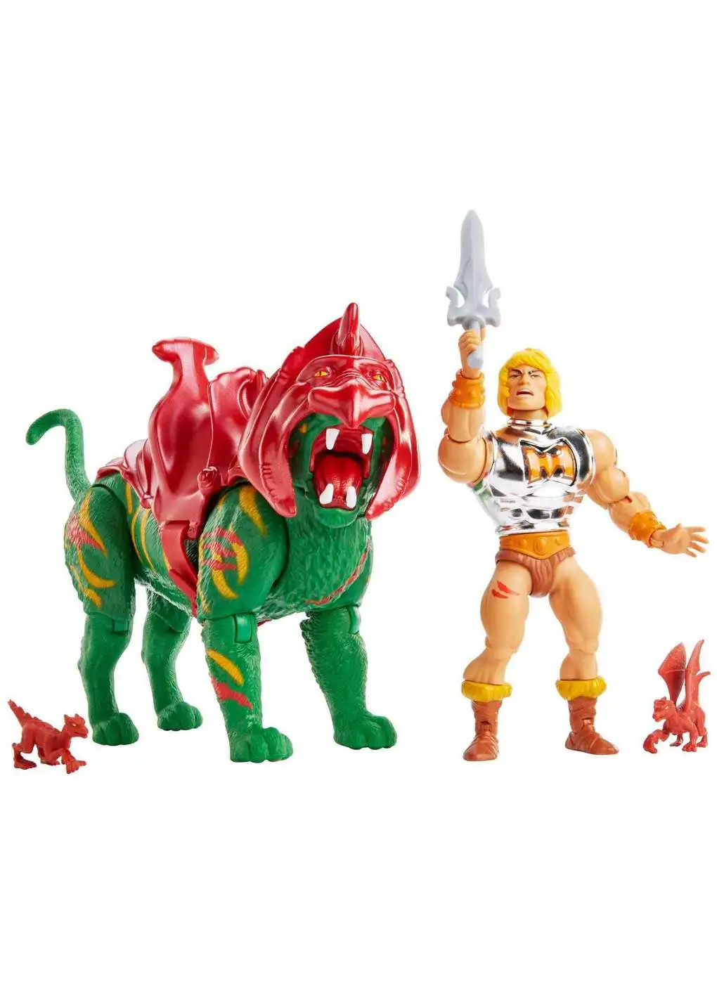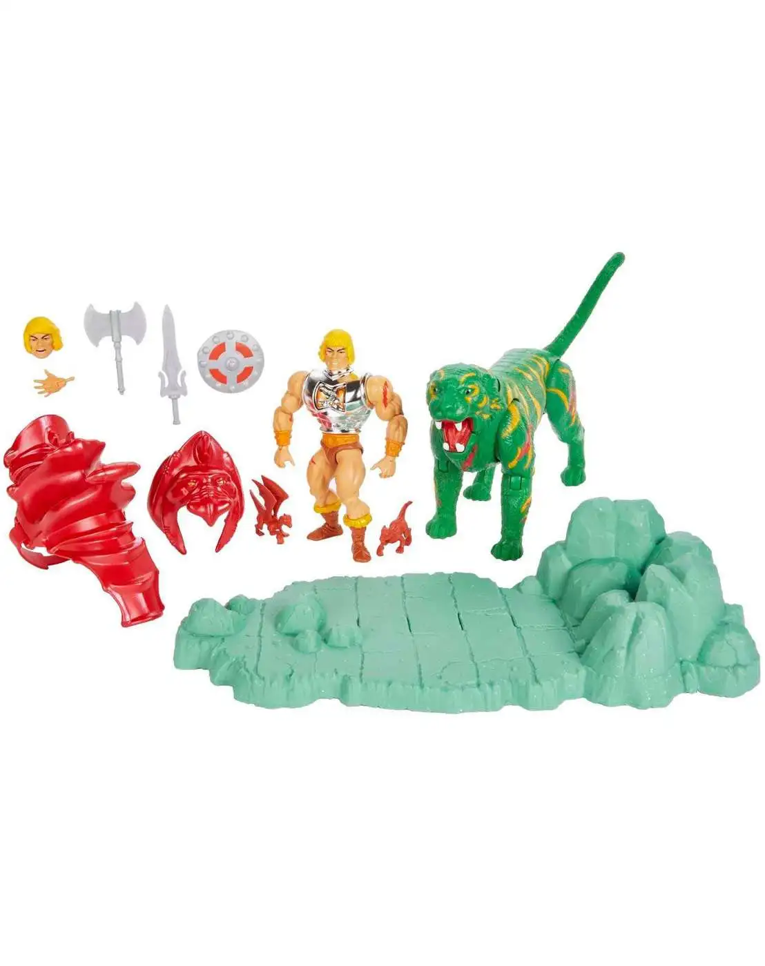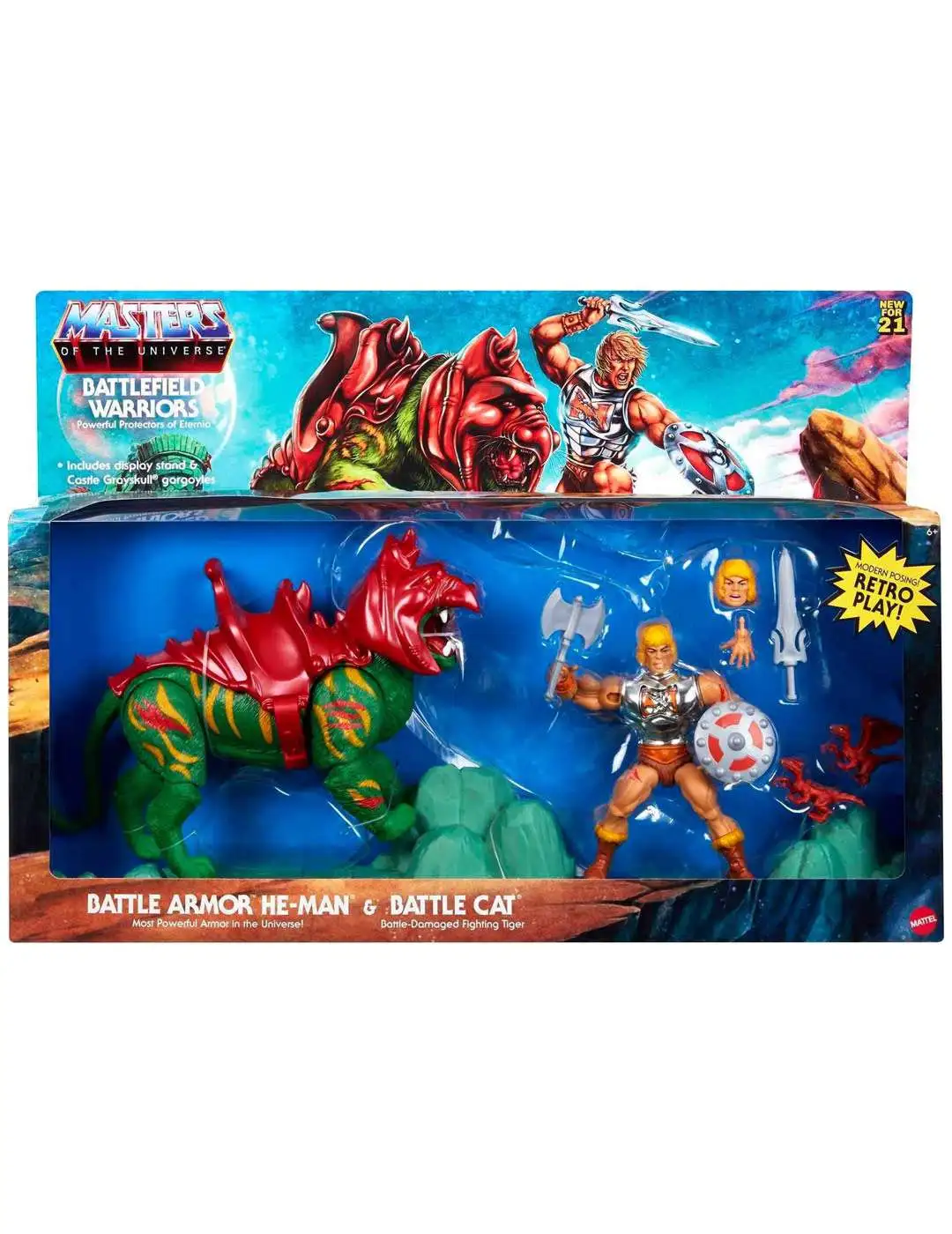 This exciting 2-pack features deluxe battle-damaged He-Man and battle-damaged Battle Cat with display stand and accessories. The Most Powerful Man in the Universe comes with alternate hand, shield and vintage-style head! Highly articulated He-Man figure can stand on its own and has 16 moveable joints including neck, shoulders, knees, hips and more for powerful poses and the fiercest battle scenes! Battle Cat, the giant green tiger whos ferociously loyal to He-Man, has 12 moveable joints including legs, head, neck, and jaw. Both feature metallic battle armor. The Battle Cat display base connects for Castle Grayskull (sold separately) for even more exciting storytelling possibilities. A thrilling gift for kids and adult collectors. By the power of Grayskull! Colors and decorations may vary.