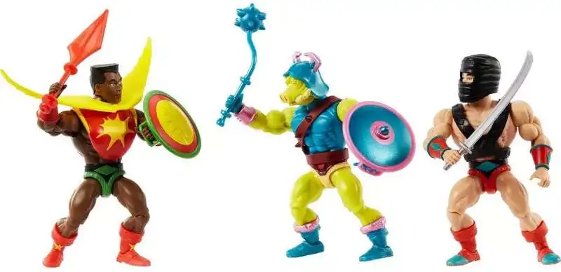 Expand any Masters of the UniverseOrigins collection with this 3-pack of retro figures — Sun-Man with Flat Top head, Space Sumo and Pig-Head, each with 16 movable joints, accessories and an exclusive trading card. These three distinctive Sun-Man and the Rulers of the Sun character figures celebrate the original He-Man animation and Rulers of the Sun toy line and are ready for a nostalgic display. Colors and decoration may vary.