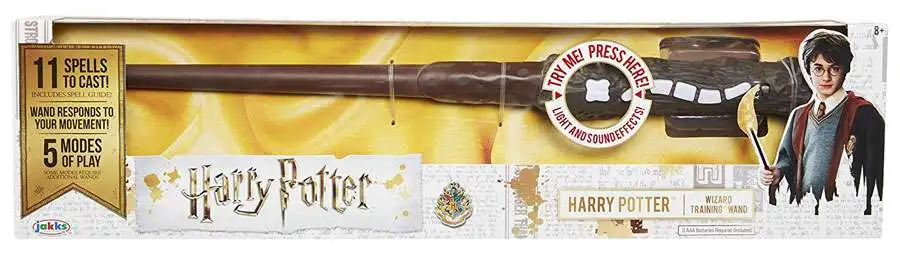 Get ready for Wizard Training! Kids can now train like a wizard with the Harry Potter Wizard Training Wands. There are 11 different spells for kids to learn and master using the included spell training guide. Learn the following spells: Locomotor, Alohomora, Incendio, Ventus, Tarantallegra, Meteolojinx, Revelio, Finite Incantatem, Arresto Momentum, Wingardium Leviosa, and Mimblewimble. The wand recognizes motion to know when kids have cast their spells. The wand provides sound feedback that the spells have been cast correctly. Each wand includes five modes of play: two modes of standalone play and three modes to play with a friend. The 5 light-up button allows you to select which mode to play. The cast button allows you to cast spells. Single Wand Mode: Spell Training – learn eleven spells, improve your skill. Hear feedback when you cast correctly. Free Play – cast the spells you have learned and test your skill. Multi-wand Mode: Spell Practice (requires 2 wands) – practice with a friend. The first to cast wins! Training Spells (requires 2 wands) – work with your friend to hear which spells work best. Choose a different spell to test each other. Wizard Tag (requires 2 or more wands) – play with 1 or more friends. Who can you tag? Rewind time to start again. The assortment includes the following wands sold separately: Harry Potter Wizard Training Wand, Albus Dumbledores Wizard Training Wand (The Elder Wand), and Lord Voldemorts Wizard Training Wand. Collect all three Wizard Training Wands. 3 AAA batteries included. For ages 8+